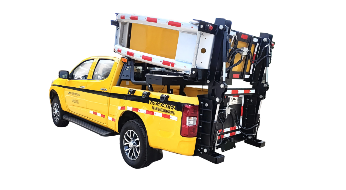 WRD5041TFZ 微型防撞缓冲车是一款采用单段式碰撞吸能装置、臂架式自动装载机构和高亮LED警示屏的轻量化施工防护车辆